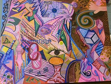 Started as a geometric abstract piece, “Cruel Summer” transformed into a colorful and otherworldly universe.